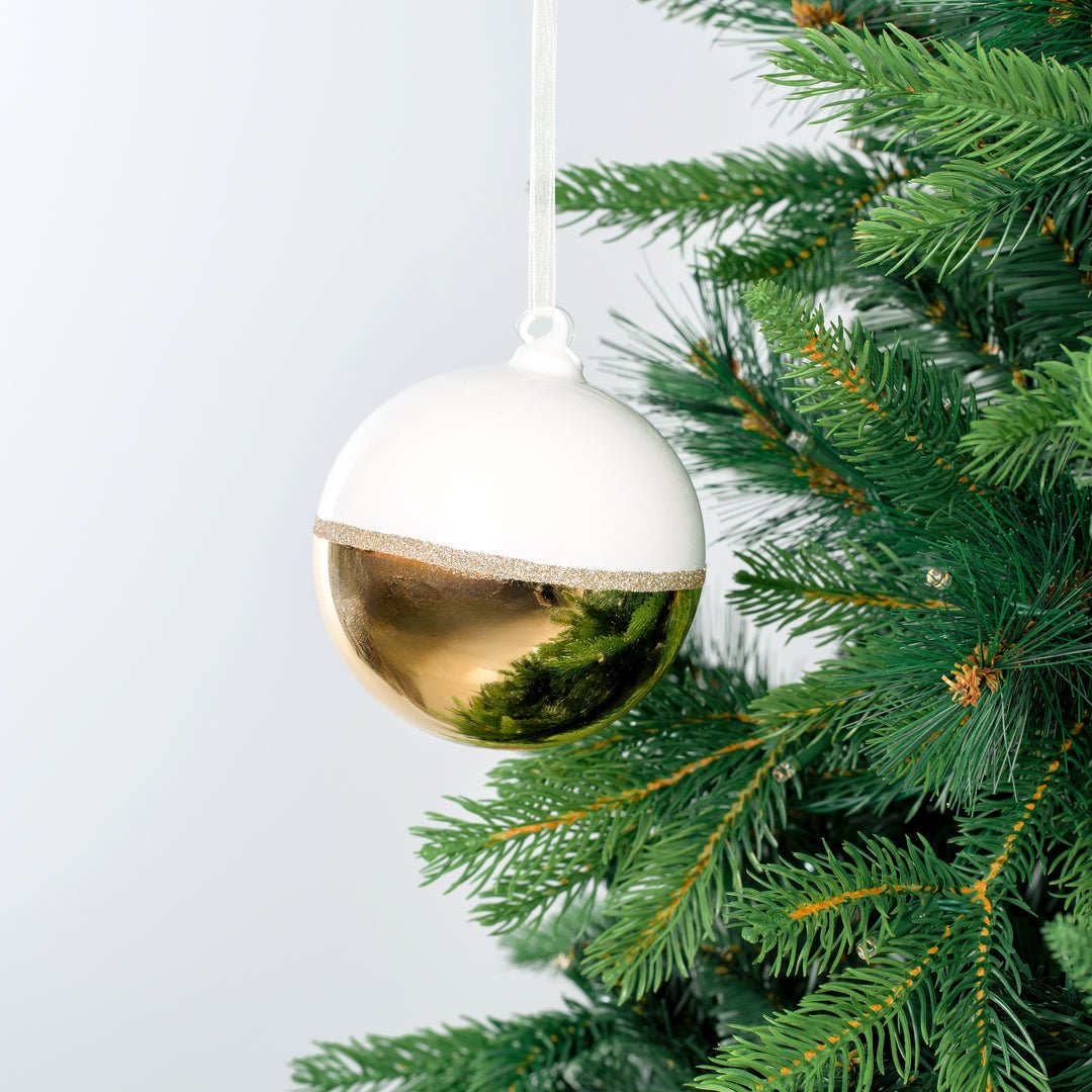 The White & Gold 10cm Glass Ball Ornament is a timeless holiday accent crafted from hand-blown glass. Its pristine white base is adorned with delicate gold detailing, creating a sophisticated and luxurious festive touch. Perfect for Christmas trees, garlands, wreaths, or tabletop displays, this ornament embodies elegance and craftsmanship. Its classic design blends seamlessly with traditional and modern holiday themes, adding sparkle and refinement to your seasonal décor.
