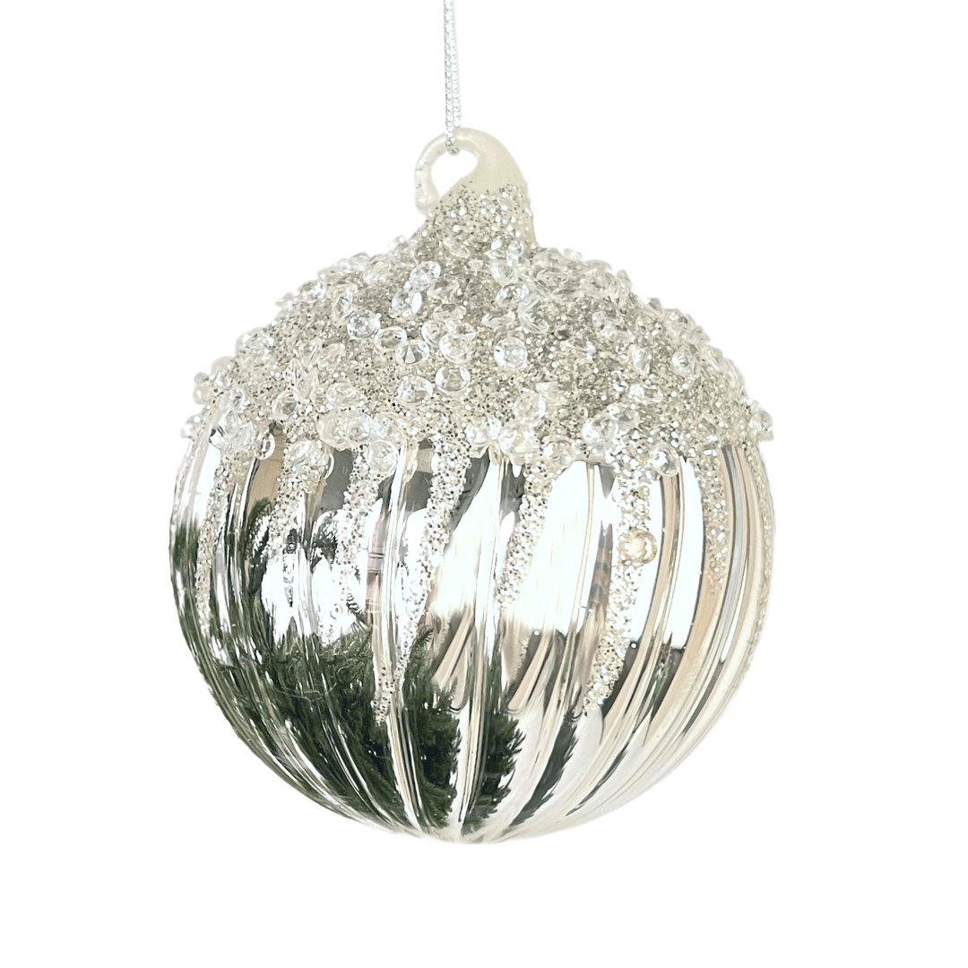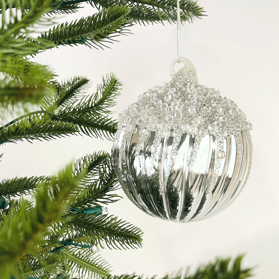 A classic festive Christmas tree ornament, complete with intricate silver sequin detailing in shimmering sliver hue. The luminous silver canvas of this timeless festive ornament is adorned with silver sequin and glitter detailing, making this an absolute must have this festive season.