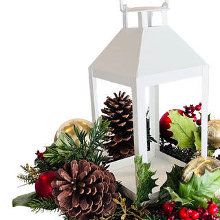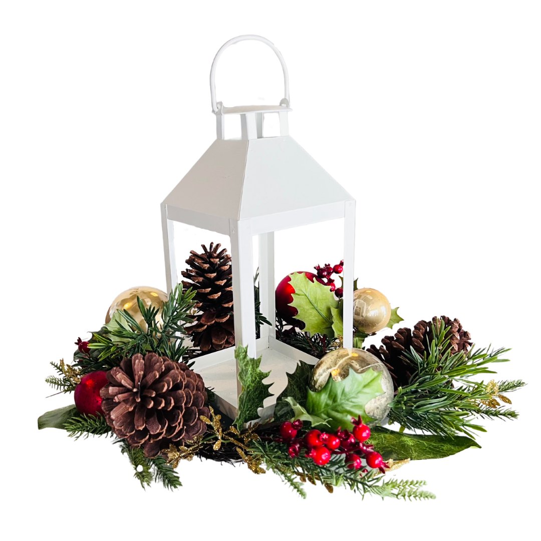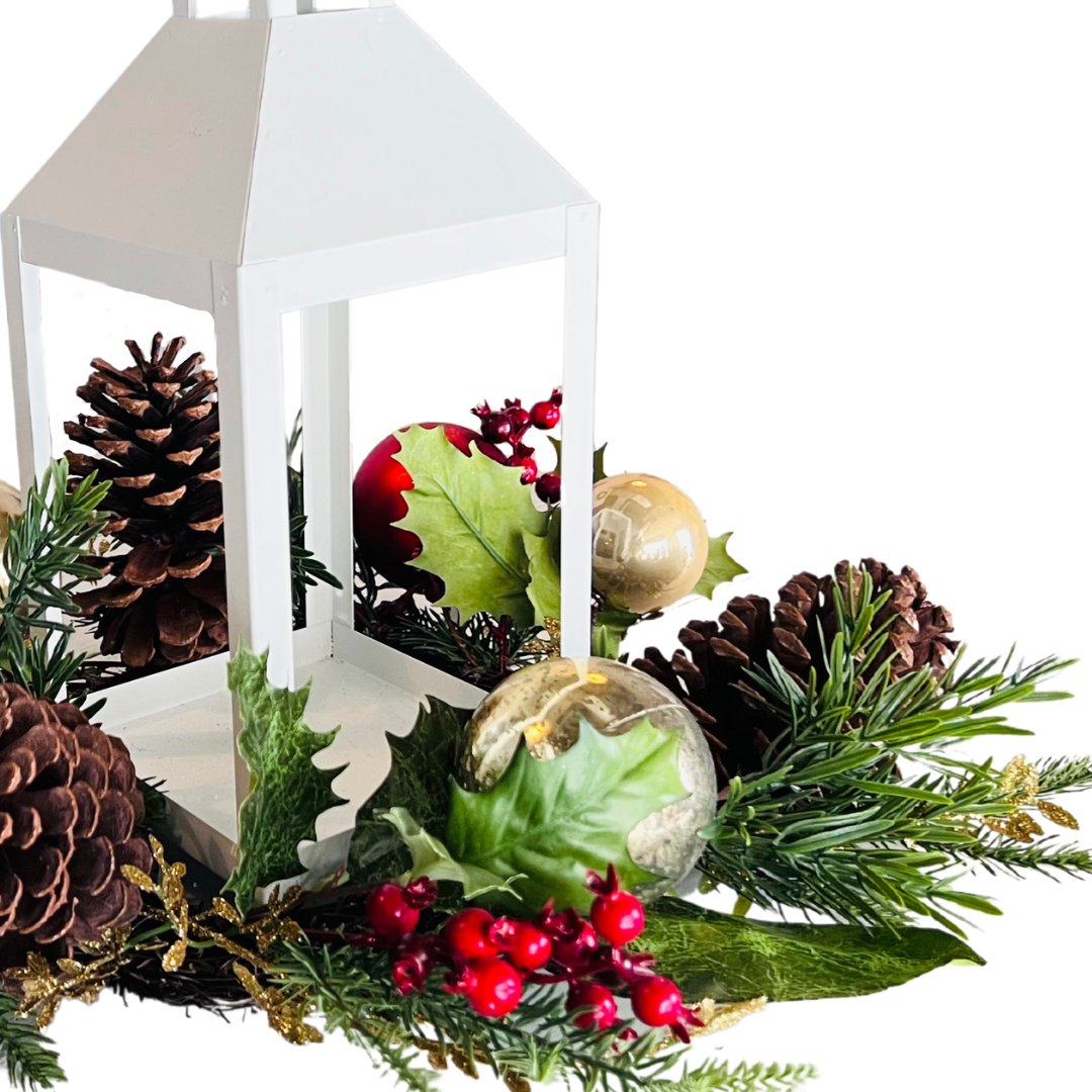 Illuminate your space with the White Lantern Pinecone and Holly Leaf Table Top, a charming centerpiece that brings festive warmth and elegance to any room. Featuring delicate pinecone and holly leaf accents, this lantern adds a cozy, seasonal touch perfect for holiday gatherings or everyday ambiance. Its classic white finish complements a variety of decor styles, making it a versatile addition to your home. Create inviting moments and enhance your table setting with this beautifully crafted lantern.